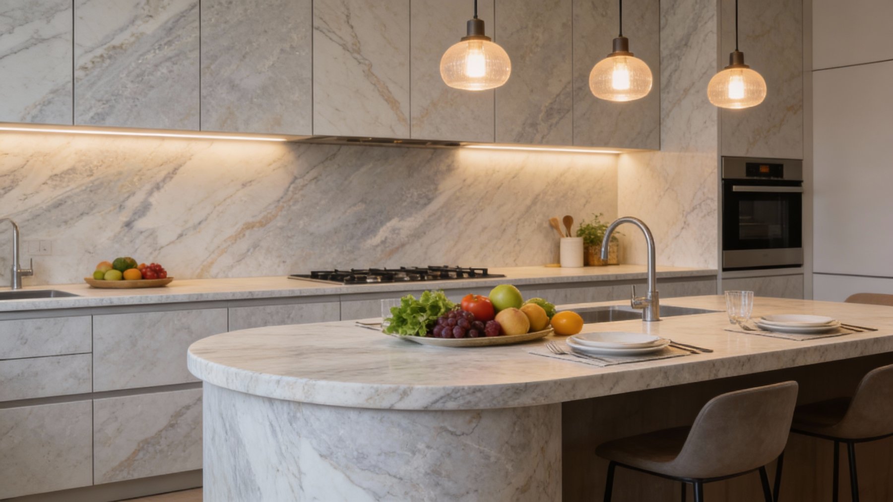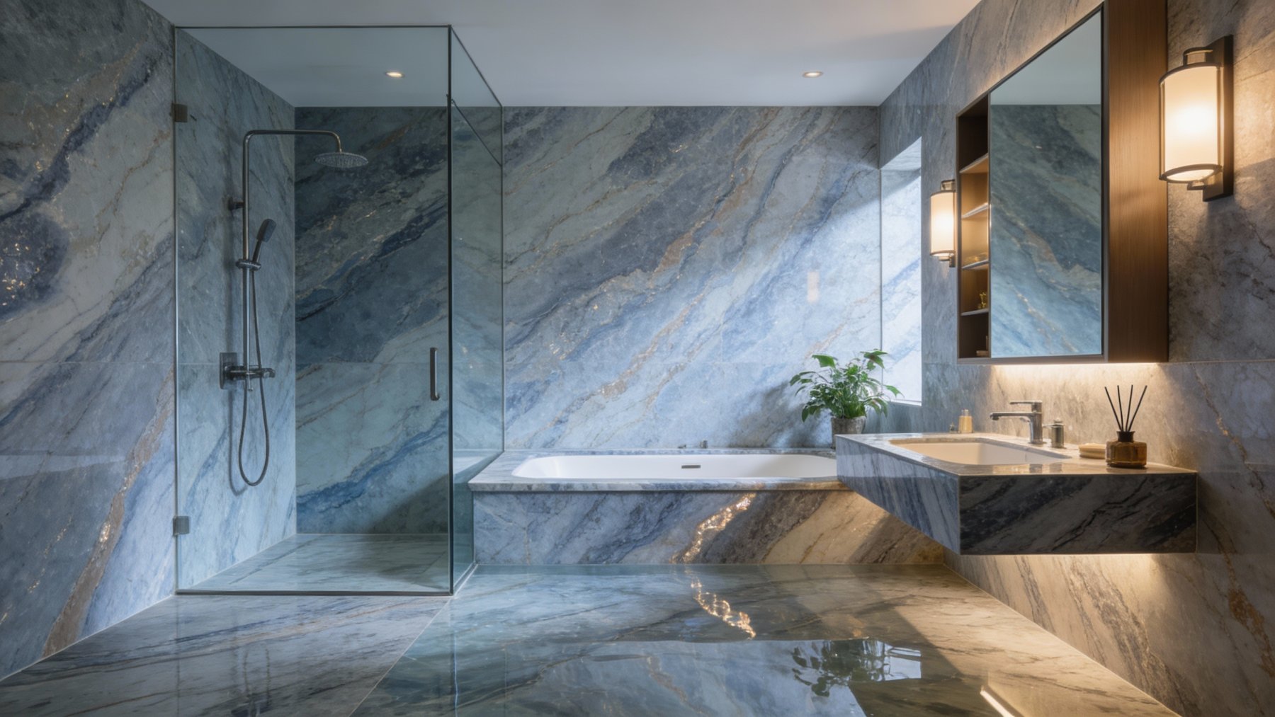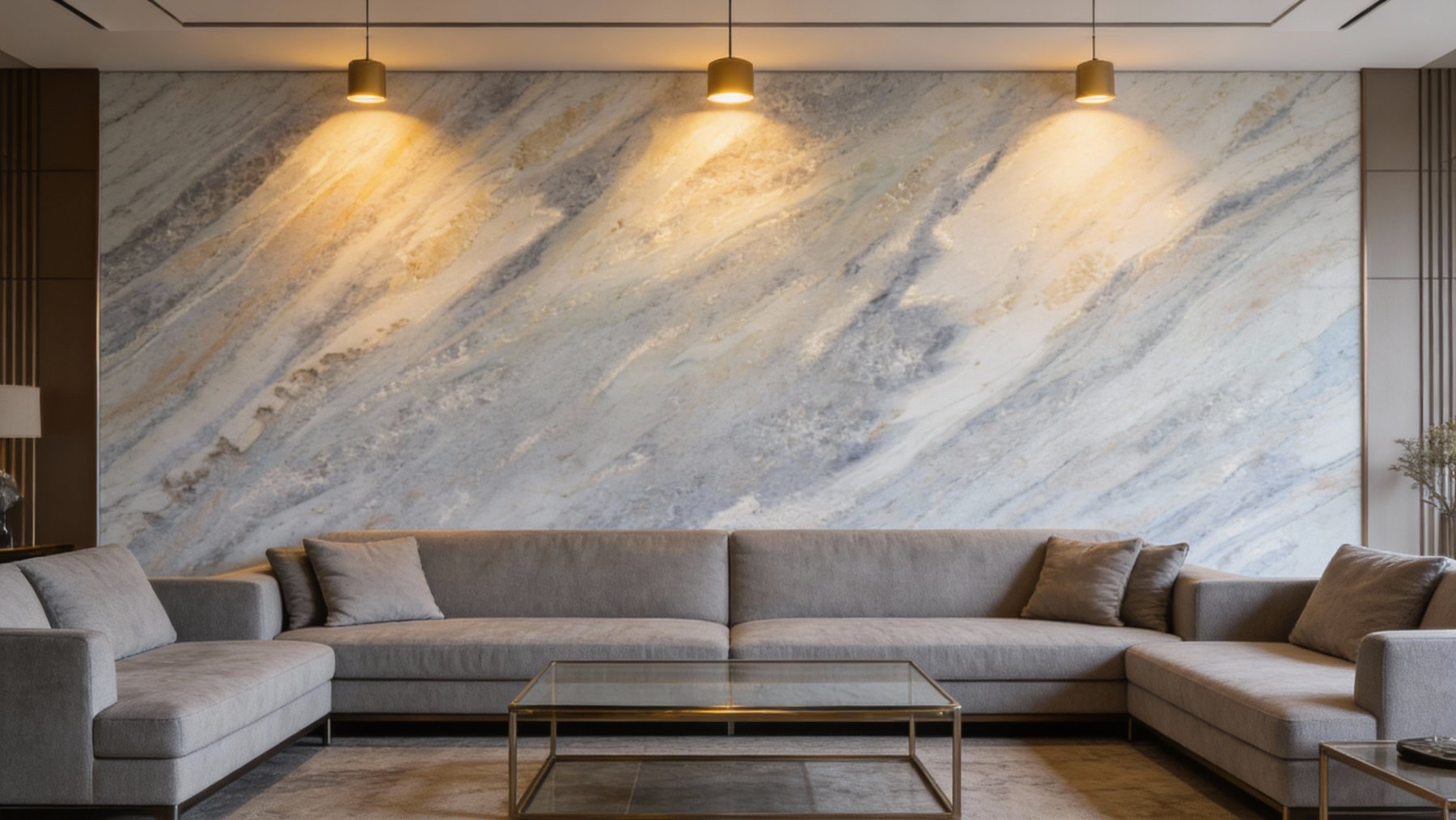 以**浅灰蓝**为核心底色,巧妙糅合淡白、浅褐的朦胧色调,整体色泽柔和内敛,无强烈色差冲突,似蒙着一层薄纱般温润静谧,既保留了石材的天然质感,又营造出雅致舒缓的视觉氛围。